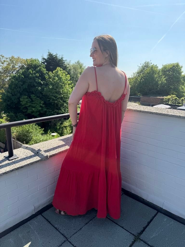 Prachtige rode lange jurk. De bandjes kan je zelf strikken en zijn dus aanpasbaar.
